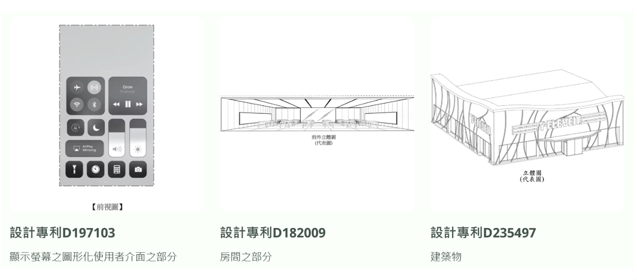 由這些案例可以發現,從食物的造型、瓶身設計、包裝設計、室內設計、建築物外觀,到手機的圖形化使用者介面(GUI),都可以申請設計專利。